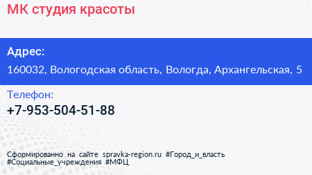 МК, студия красоты по адресу 160032, Вологодская область, Вологда, Архангельская, 5 в дальнейшем Организация, размещена в следующих категориях: