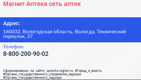 Магнит Аптека, сеть аптек по адресу 160032, Вологодская область, Вологда, Технический переулок, 37 в дальнейшем Организация, размещена в следующих категориях:
