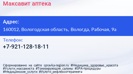 Максавит, аптека по адресу 160012, Вологодская область, Вологда, Рабочая, 9а в дальнейшем Организация, размещена в следующих категориях: