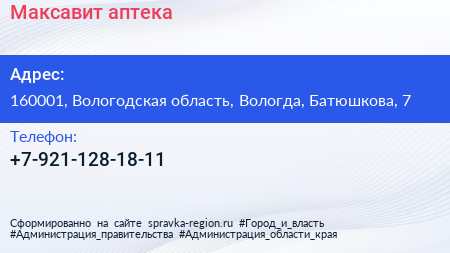 Максавит, аптека по адресу 160001, Вологодская область, Вологда, Батюшкова, 7 в дальнейшем Организация, размещена в следующих категориях: