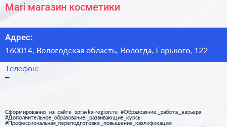 Mari, магазин косметики по адресу 160014, Вологодская область, Вологда, Горького, 122 в дальнейшем Организация, размещена в следующих категориях: