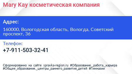 Mary Kay, косметическая компания по адресу 160000, Вологодская область, Вологда, Советский проспект, 36 в дальнейшем Организация, размещена в следующих категориях: