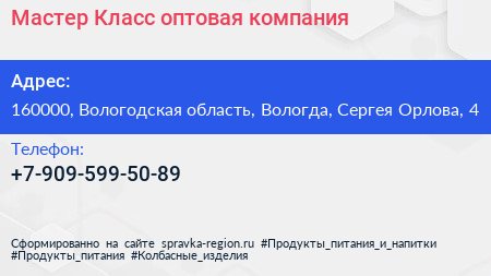 Мастер Класс, оптовая компания по адресу 160000, Вологодская область, Вологда, Сергея Орлова, 4 в дальнейшем Организация, размещена в следующих категориях: