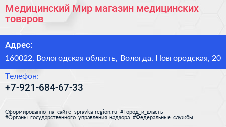 Медицинский Мир, магазин медицинских товаров по адресу 160022, Вологодская область, Вологда, Новгородская, 20 в дальнейшем Организация, размещена в следующих категориях: