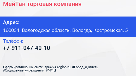 МейТан, торговая компания по адресу 160034, Вологодская область, Вологда, Костромская, 5 в дальнейшем Организация, размещена в следующих категориях:
