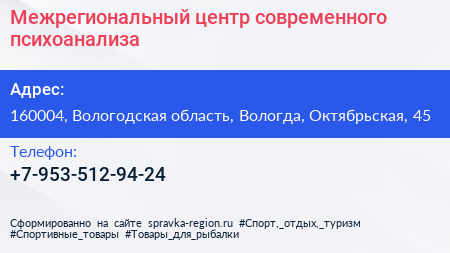 Межрегиональный центр современного психоанализа по адресу 160004, Вологодская область, Вологда, Октябрьская, 45 в дальнейшем Организация, размещена в следующих категориях: