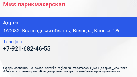 Miss, парикмахерская по адресу 160032, Вологодская область, Вологда, Конева, 18г в дальнейшем Организация, размещена в следующих категориях: