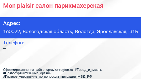 Mon plaisir, салон-парикмахерская по адресу 160022, Вологодская область, Вологда, Ярославская, 31Б в дальнейшем Организация, размещена в следующих категориях: