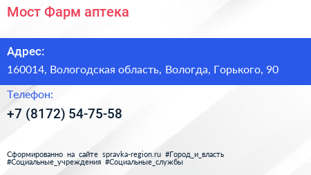 Мост-Фарм, аптека по адресу 160014, Вологодская область, Вологда, Горького, 90 в дальнейшем Организация, размещена в следующих категориях: