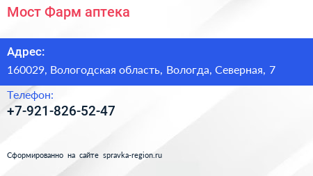 Мост-Фарм, аптека по адресу 160029, Вологодская область, Вологда, Северная, 7 в дальнейшем Организация, размещена в следующих категориях: