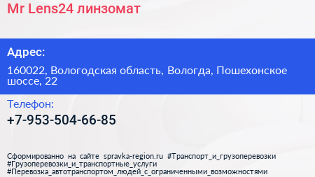 Mr.Lens24, линзомат по адресу 160022, Вологодская область, Вологда, Пошехонское шоссе, 22 в дальнейшем Организация, размещена в следующих категориях: