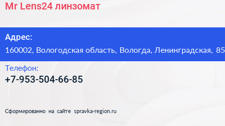 Mr.Lens24, линзомат по адресу 160002, Вологодская область, Вологда, Ленинградская, 85 в дальнейшем Организация, размещена в следующих категориях:
