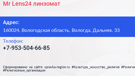 Mr.Lens24, линзомат по адресу 160024, Вологодская область, Вологда, Дальняя, 33 в дальнейшем Организация, размещена в следующих категориях: