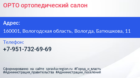 ОРТО, ортопедический салон по адресу 160001, Вологодская область, Вологда, Батюшкова, 11 в дальнейшем Организация, размещена в следующих категориях:
