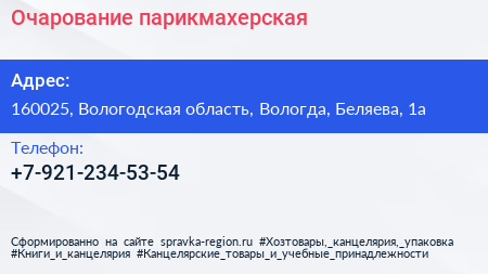 Очарование, парикмахерская по адресу 160025, Вологодская область, Вологда, Беляева, 1а в дальнейшем Организация, размещена в следующих категориях: