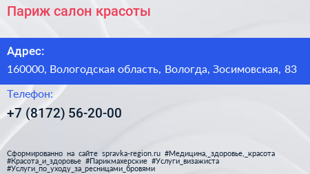 Париж, салон красоты по адресу 160000, Вологодская область, Вологда, Зосимовская, 83 в дальнейшем Организация, размещена в следующих категориях: