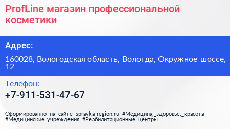 ProfLine, магазин профессиональной косметики по адресу 160028, Вологодская область, Вологда, Окружное шоссе, 12 в дальнейшем Организация, размещена в следующих категориях:
