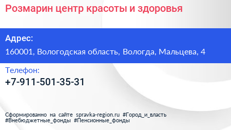 Розмарин, центр красоты и здоровья по адресу 160001, Вологодская область, Вологда, Мальцева, 4 в дальнейшем Организация, размещена в следующих категориях: