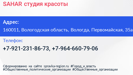SAHAR, студия красоты по адресу 160011, Вологодская область, Вологда, Первомайская, 35а в дальнейшем Организация, размещена в следующих категориях: