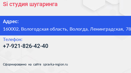 Si, студия шугаринга по адресу 160002, Вологодская область, Вологда, Ленинградская, 78 в дальнейшем Организация, размещена в следующих категориях: