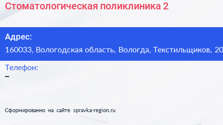 Стоматологическая поликлиника №2 по адресу 160033, Вологодская область, Вологда, Текстильщиков, 20 в дальнейшем Организация, размещена в следующих категориях: