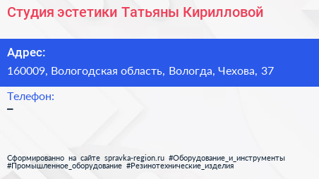 Студия эстетики Татьяны Кирилловой по адресу 160009, Вологодская область, Вологда, Чехова, 37 в дальнейшем Организация, размещена в следующих категориях: