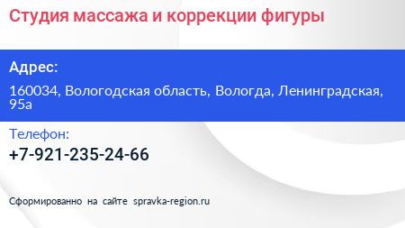 Студия массажа и коррекции фигуры по адресу 160034, Вологодская область, Вологда, Ленинградская, 95а в дальнейшем Организация, размещена в следующих категориях: