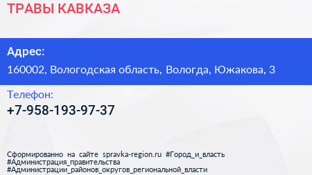 ТРАВЫ КАВКАЗА по адресу 160002, Вологодская область, Вологда, Южакова, 3 в дальнейшем Организация, размещена в следующих категориях: