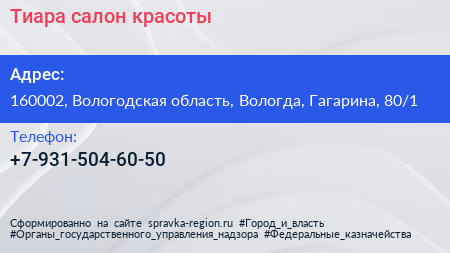 Тиара, салон красоты по адресу 160002, Вологодская область, Вологда, Гагарина, 80/1 в дальнейшем Организация, размещена в следующих категориях: