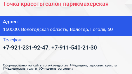 Точка красоты, салон-парикмахерская по адресу 160000, Вологодская область, Вологда, Гоголя, 60 в дальнейшем Организация, размещена в следующих категориях: