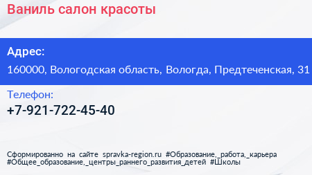 Ваниль, салон красоты по адресу 160000, Вологодская область, Вологда, Предтеченская, 31 в дальнейшем Организация, размещена в следующих категориях:
