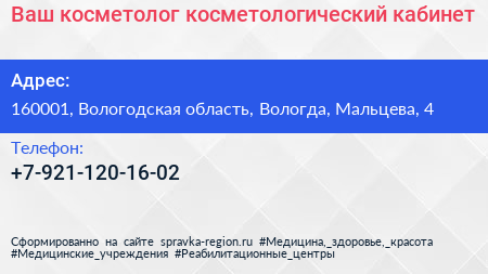 Ваш косметолог, косметологический кабинет по адресу 160001, Вологодская область, Вологда, Мальцева, 4 в дальнейшем Организация, размещена в следующих категориях: