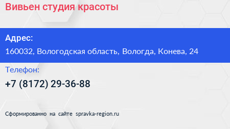 Вивьен, студия красоты по адресу 160032, Вологодская область, Вологда, Конева, 24 в дальнейшем Организация, размещена в следующих категориях: