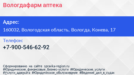 Вологдафарм, аптека по адресу 160032, Вологодская область, Вологда, Конева, 17 в дальнейшем Организация, размещена в следующих категориях: