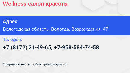 Wellness, салон красоты по адресу Вологодская область, Вологда, Возрождения, 47 в дальнейшем Организация, размещена в следующих категориях: