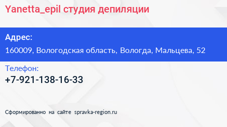 Yanetta_epil, студия депиляции по адресу 160009, Вологодская область, Вологда, Мальцева, 52 в дальнейшем Организация, размещена в следующих категориях: