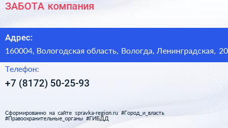 ЗАБОТА, компания по адресу 160004, Вологодская область, Вологда, Ленинградская, 20 в дальнейшем Организация, размещена в следующих категориях: