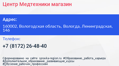 Центр Медтехники, магазин по адресу 160002, Вологодская область, Вологда, Ленинградская, 146 в дальнейшем Организация, размещена в следующих категориях:
