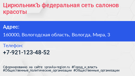ЦирюльникЪ, федеральная сеть салонов красоты по адресу 160000, Вологодская область, Вологда, Мира, 3 в дальнейшем Организация, размещена в следующих категориях: