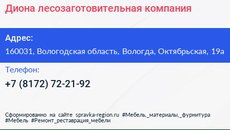 Диона, лесозаготовительная компания по адресу 160031, Вологодская область, Вологда, Октябрьская, 19а в дальнейшем Организация, размещена в следующих категориях: