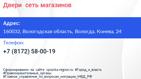 Двери+, сеть магазинов по адресу 160032, Вологодская область, Вологда, Конева, 24 в дальнейшем Организация, размещена в следующих категориях: