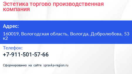 Эстетика, торгово-производственная компания по адресу 160019, Вологодская область, Вологда, Добролюбова, 53 к2 в дальнейшем Организация, размещена в следующих категориях: