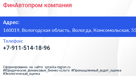 ФинАвтопром, компания по адресу 160019, Вологодская область, Вологда, Комсомольская, 55 в дальнейшем Организация, размещена в следующих категориях: