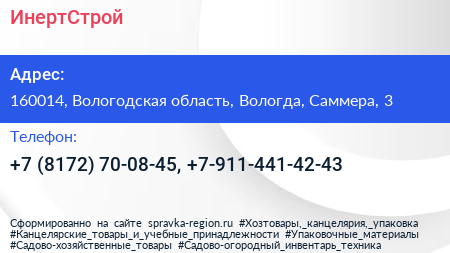 ИнертСтрой по адресу 160014, Вологодская область, Вологда, Саммера, 3 в дальнейшем Организация, размещена в следующих категориях: