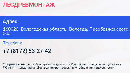 ЛЕСДРЕВМОНТАЖ по адресу 160026, Вологодская область, Вологда, Преображенского, 30а в дальнейшем Организация, размещена в следующих категориях: