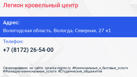 Легион, кровельный центр по адресу Вологодская область, Вологда, Северная, 27 к1 в дальнейшем Организация, размещена в следующих категориях: