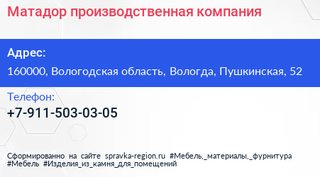 Матадор, производственная компания по адресу 160000, Вологодская область, Вологда, Пушкинская, 52 в дальнейшем Организация, размещена в следующих категориях: