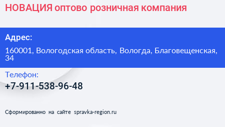НОВАЦИЯ, оптово-розничная компания по адресу 160001, Вологодская область, Вологда, Благовещенская, 34 в дальнейшем Организация, размещена в следующих категориях: