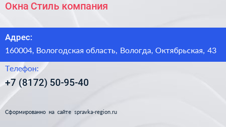 Окна Стиль, компания по адресу 160004, Вологодская область, Вологда, Октябрьская, 43 в дальнейшем Организация, размещена в следующих категориях: