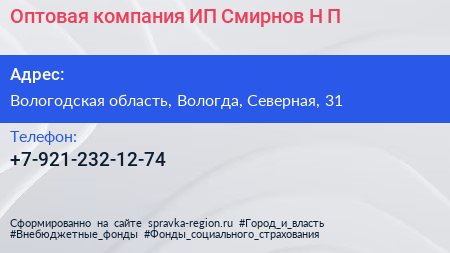 Оптовая компания, ИП Смирнов Н.П. по адресу Вологодская область, Вологда, Северная, 31 в дальнейшем Организация, размещена в следующих категориях: